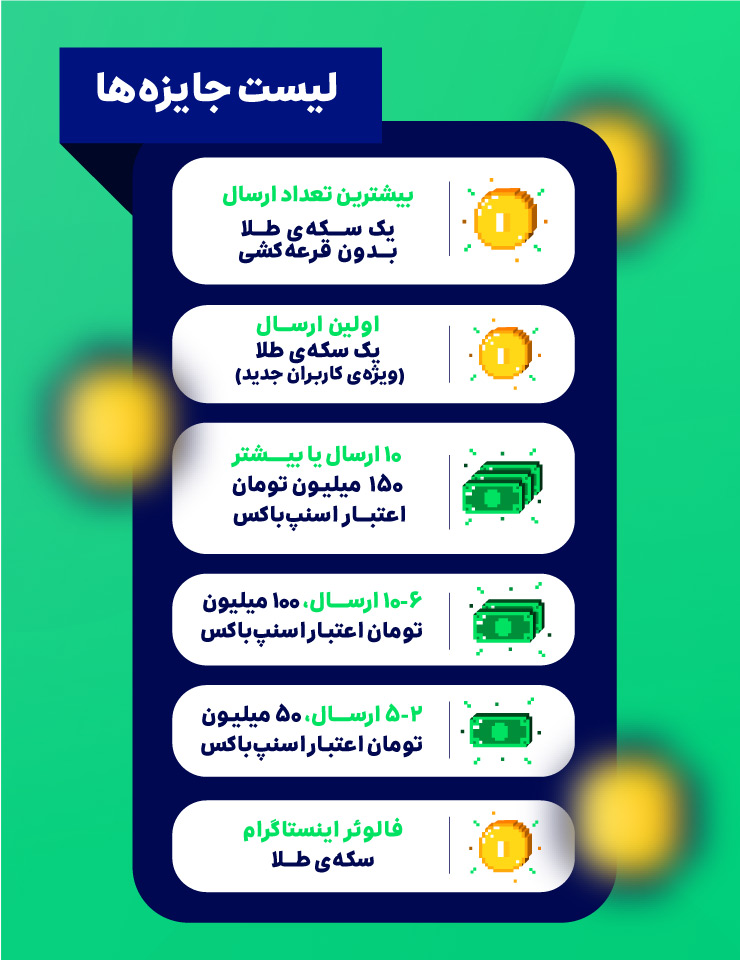 - بیشترین تعداد ارسال: یک سکهی طلا بدون قرعهکشی